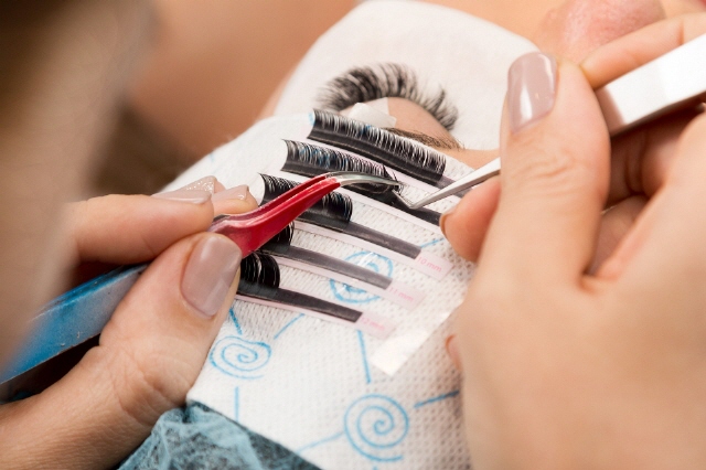 Die Einzelwimpern applizieren wir mit einem wasserfesten Spezialkleber auf den eigenen Wimpern.