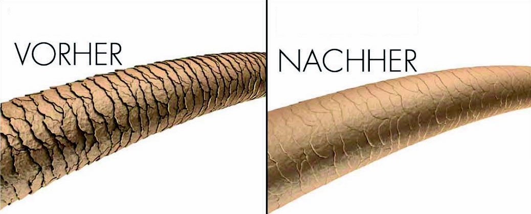 Die Cuticula, die äußere Haarhülle, wird geglättet und restrukturiert.